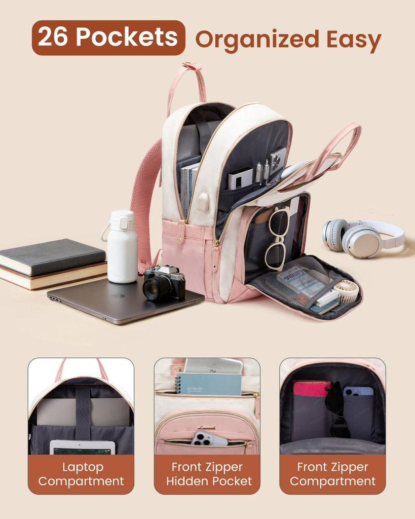 Brand: LOVEVOOKColor: Beige-pink-pinkFeatures: 【LARGE CAPACITY】One backpack to solve all travel troubles. The large capacity laptop backpack has 6 compartments and more than 26 pockets, which can organize your travel items in an orderly manner, easy for holding laptop, ipads, Phone, binder, water bottle, umbrella, readers, journal, magazine, clothes, pens, wallet...