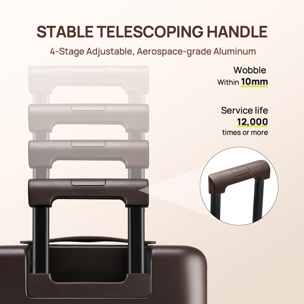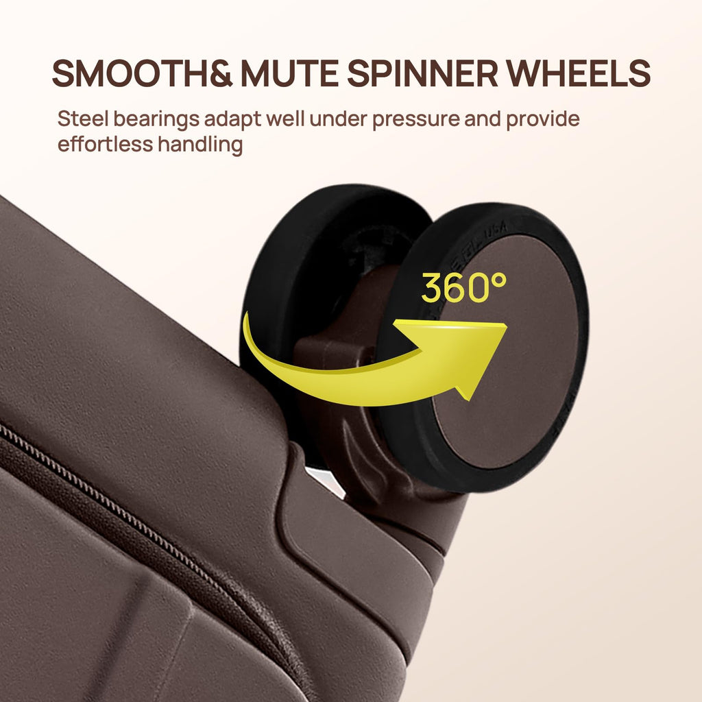 - 【Effortless Mobility System】Engineered with 4 silent double spinner wheels and a durable aluminum telescoping handle featuring <15mm wobble tolerance, this suitcase delivers precise, stable maneuverability in all travel environments. The precision wheel system glides effortlessly across surfaces, while the ultra-stable handle maintains comfortable control during extended use.