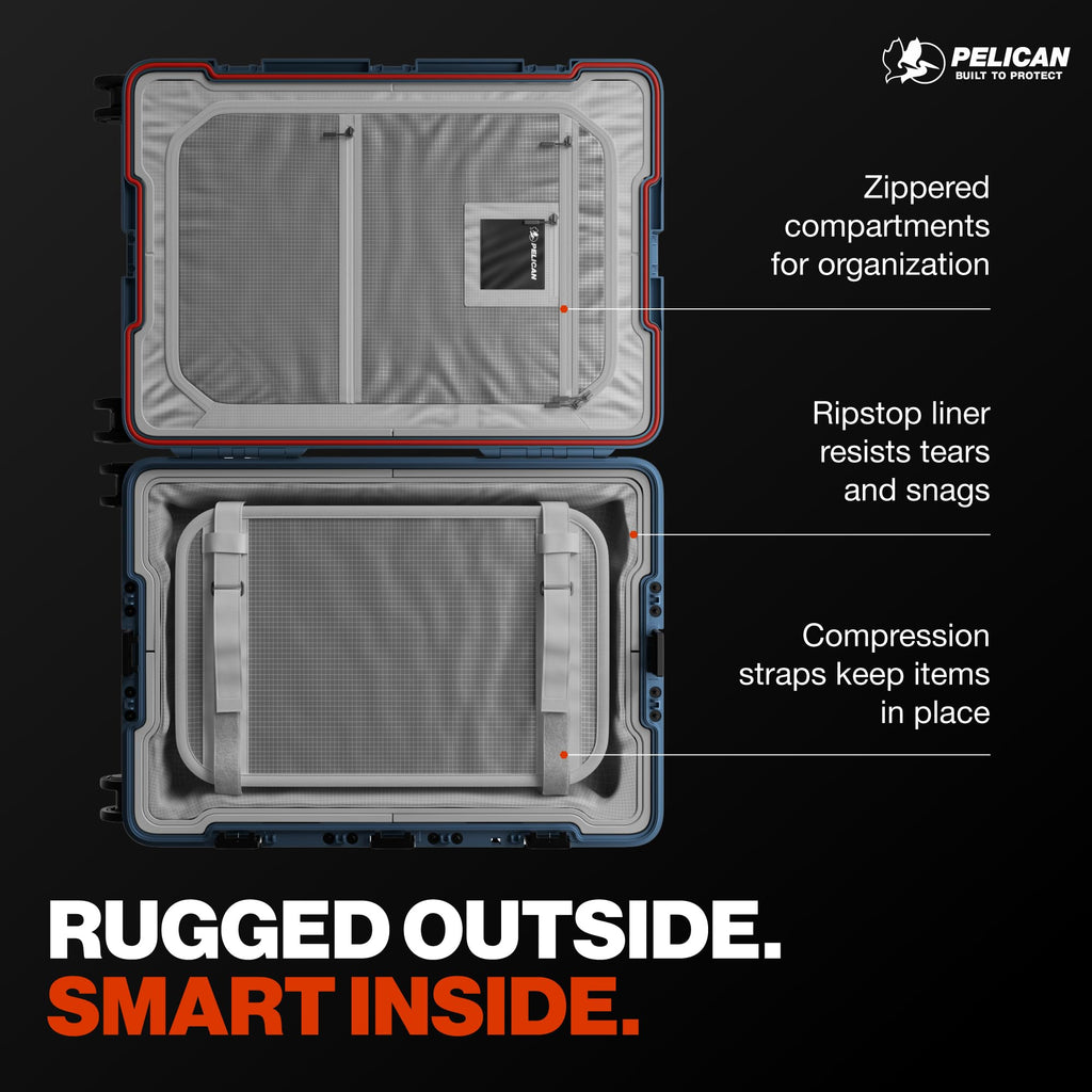 - EXTERNAL FEATURES: Extreme Durability with Pelican Armor construction will protect your valuables. Comes with multi-stage extension handle, TSA locking latches integrated to ensure your belongings stay safe. Hinomoto 360-degree spinner wheels for effortless navigation. Waterproof and Dustproof with a sealed design to protect against the elements.