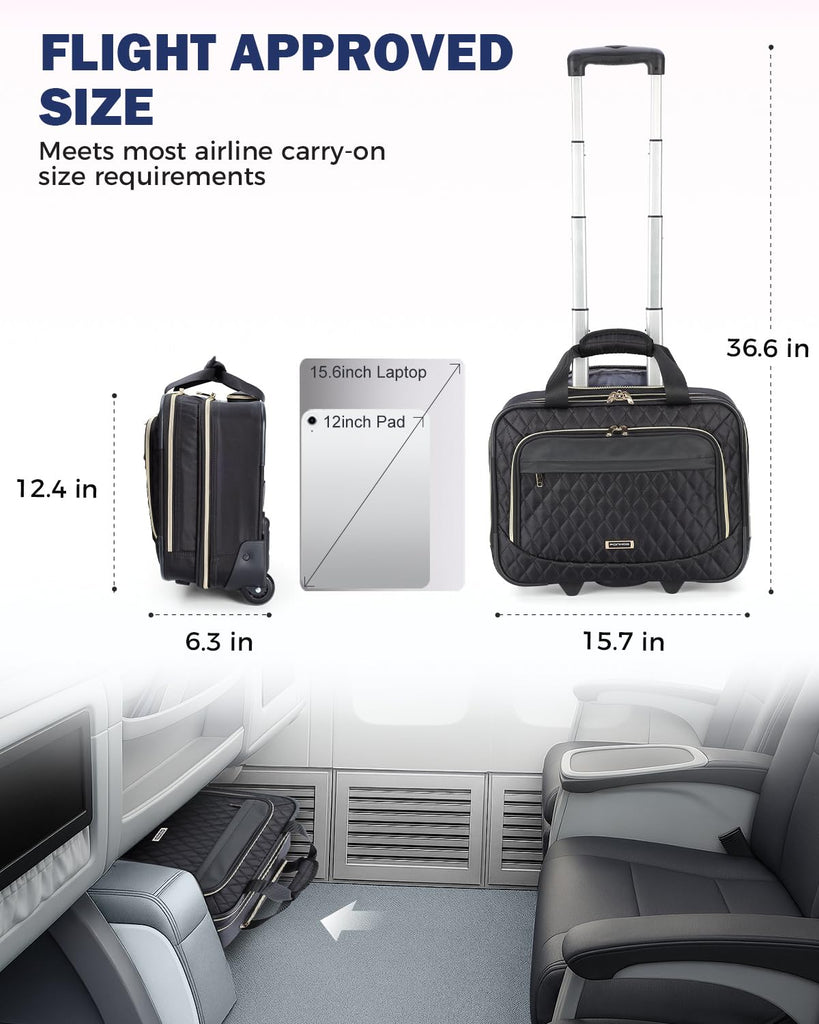Brand: PonhogColor: BlackFeatures: Multi Layer Storage: Rolling laptop bag offers 3 compartments and 16 pockets, this bag securely stores your laptop, documents, and personal items, keeping you organized for business or leisure travel Flight Approved Size: Measuring at 15.7 x 6.3 x 12.4 inches meet most airline personal item size...
