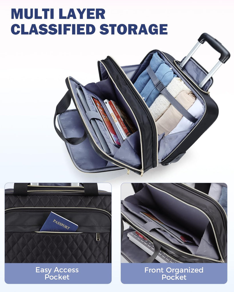 - Multi Layer Storage: Rolling laptop bag offers 3 compartments and 16 pockets, this bag securely stores your laptop, documents, and personal items, keeping you organized for business or leisure travel