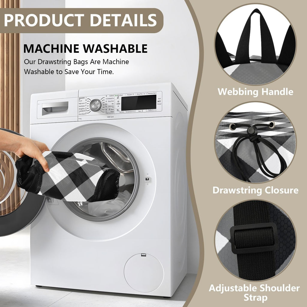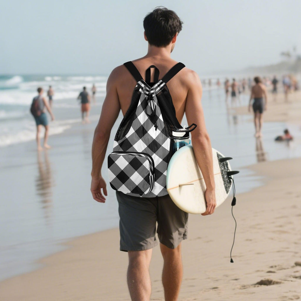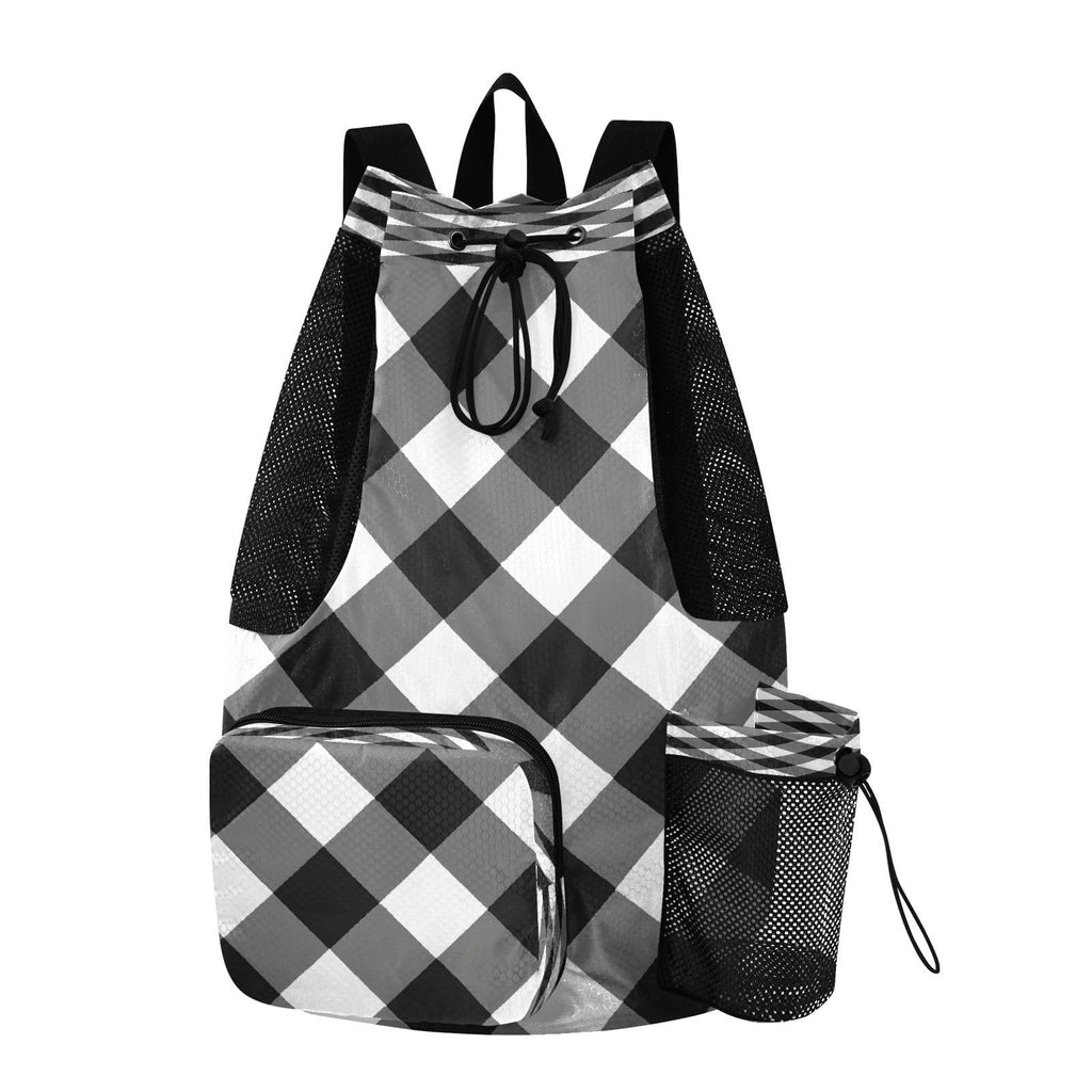 Quteprint Mesh Gym Swimming Bags for Men & Women, Black White Plaid Buffalo Large Drawstring Backpack with Dry-Wet Pocket, Lightweight Gym Bag for Sports, Travel, Beach, Workout Gear