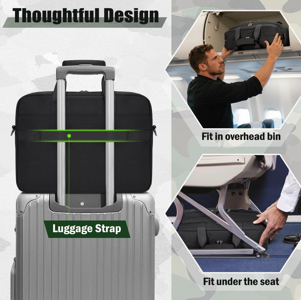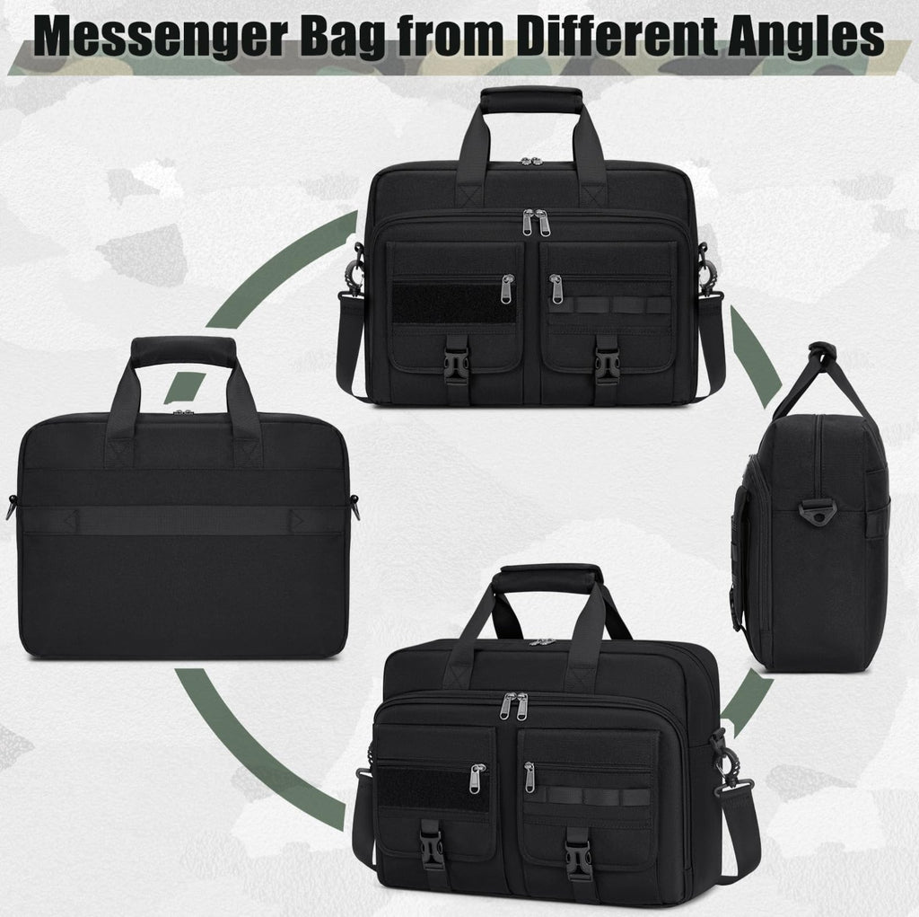 - COMFORTABLE & CONVENIENT: The padded shoulder strap of this tactical laptop briefcases is detachable and adjustable, providing flexible carrying options. The messenger bag for men also features a sturdy, ergonomically designed padded handle that offers a comfortable grip, making it easy to carry for extended periods without strain or discomfort. A luggage strap on the back allows the bag to be securely attached to the handle of a suitcase or trolley, ensuring added convenience during travel.