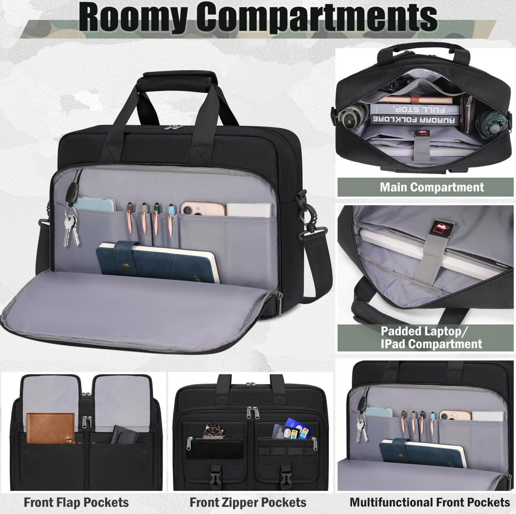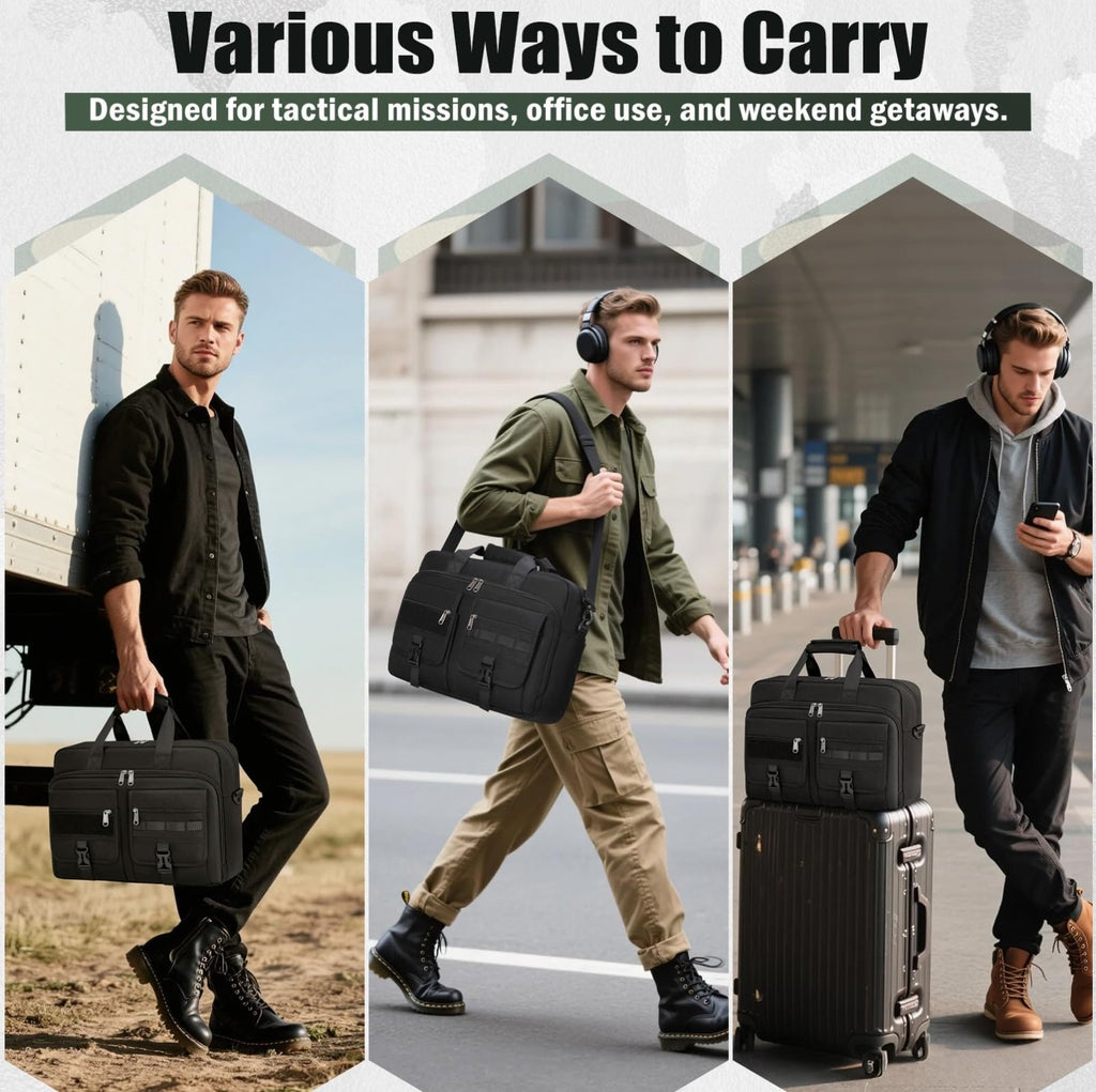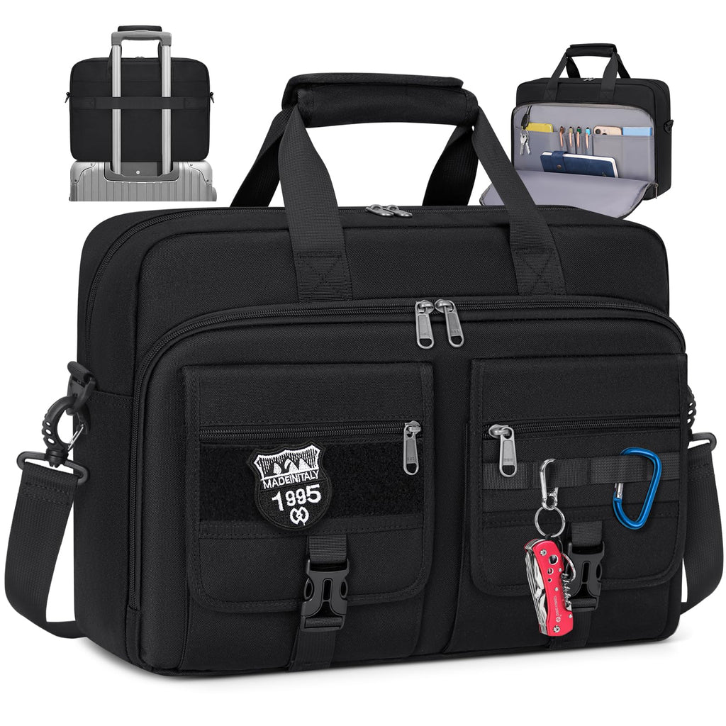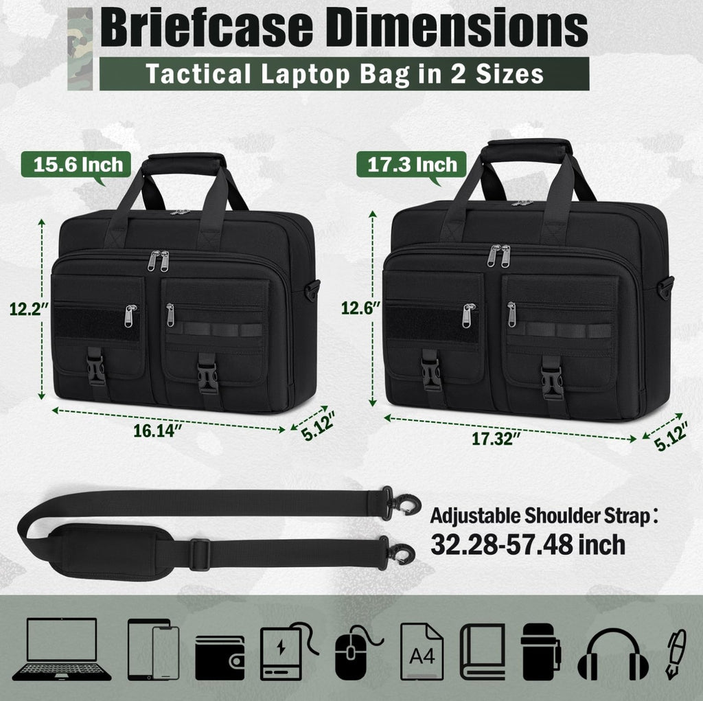 - WELL-ORGANIZED LARGE CAPACITY: Designed with over 10 practical pockets, this tactical laptop bag features a padded main compartment for laptops up to 17.3 inch, a dedicated iPad sleeve, mesh pockets for chargers and accessories, and multiple front organizer pockets for documents, notebooks, and daily gear. Easily fits work essentials plus clothes or travel items, and features a tactical MOLLE system and patch area for customization.
