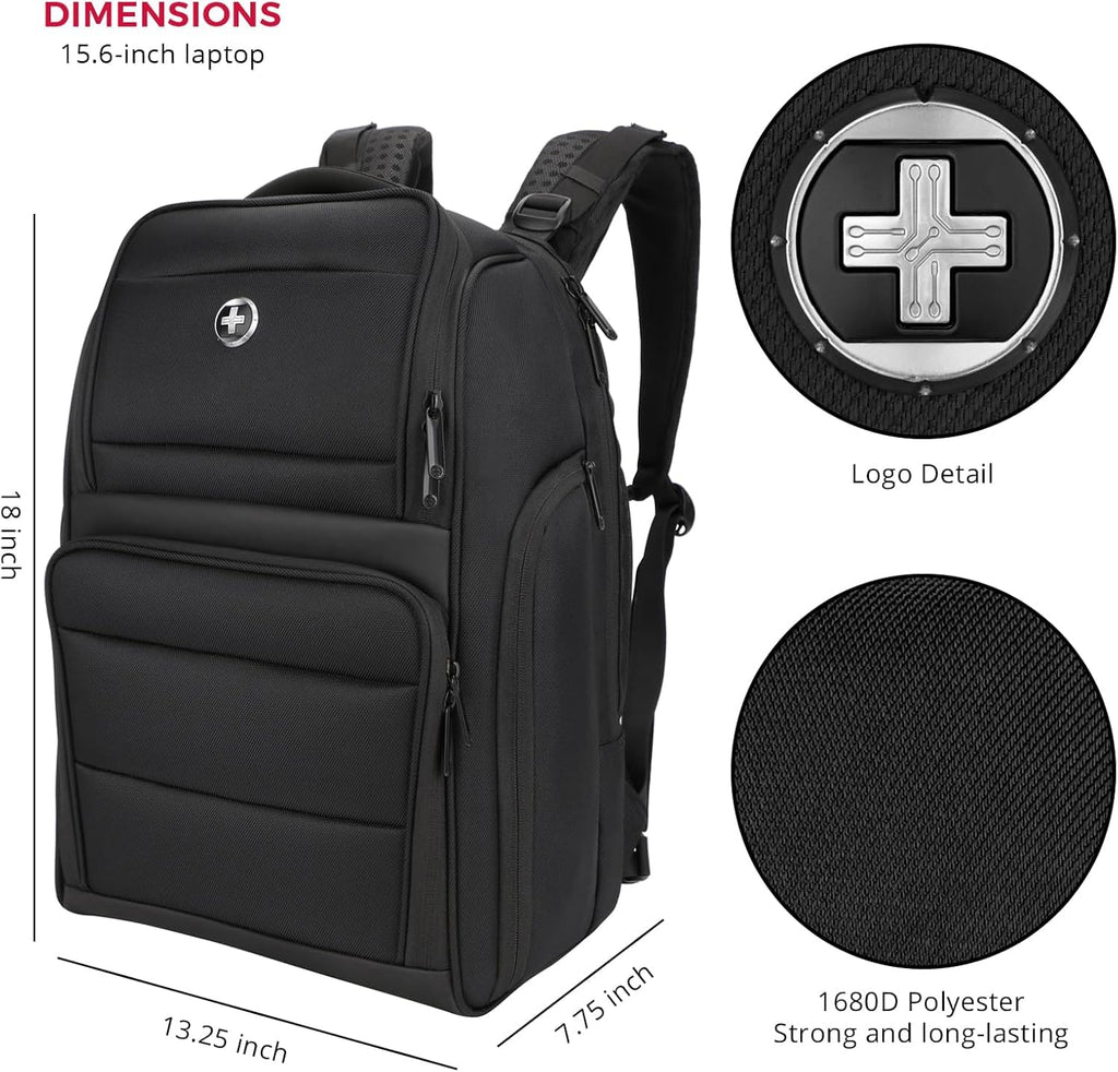 Brand: SwissdigitalColor: BlackFeatures: LARGE CAPACITY: Dimensions: 18" x 13.25" x 7.75" (backpack with laptop compartment a 15.6" notebook). Our large laptop backpack features 10+ multi-functional pockets and 2 spacious main compartments. The primary compartment holds 4-5 items of clothing, casual shoes, magazines, and other essentials, while the two front pockets...