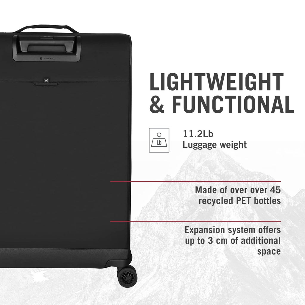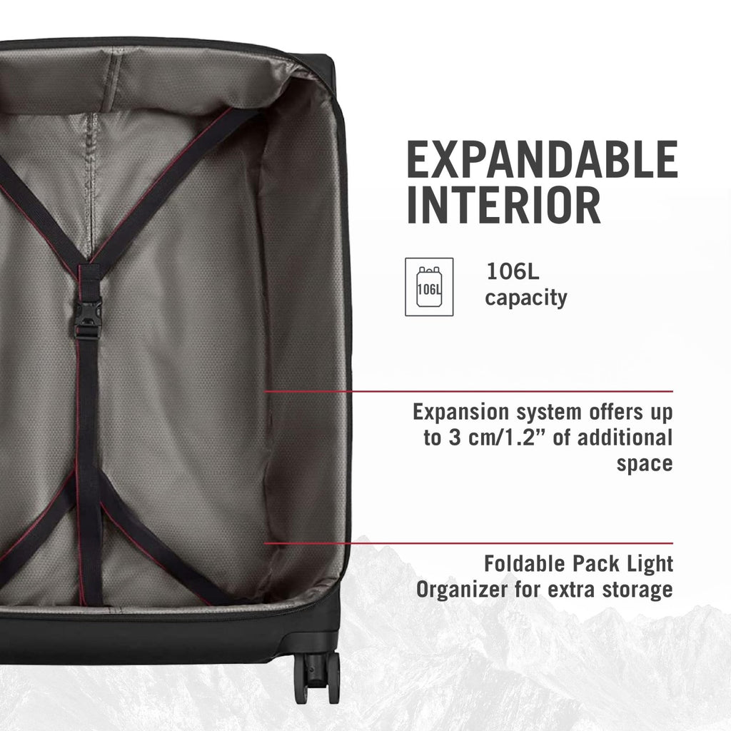 Victorinox Crosslight Large Softside Case - Large Travel Luggage with Spinner Wheels - Premium Traveling Essentials - Includes Foldable Pack Light Organizer - 106 Liter, Black