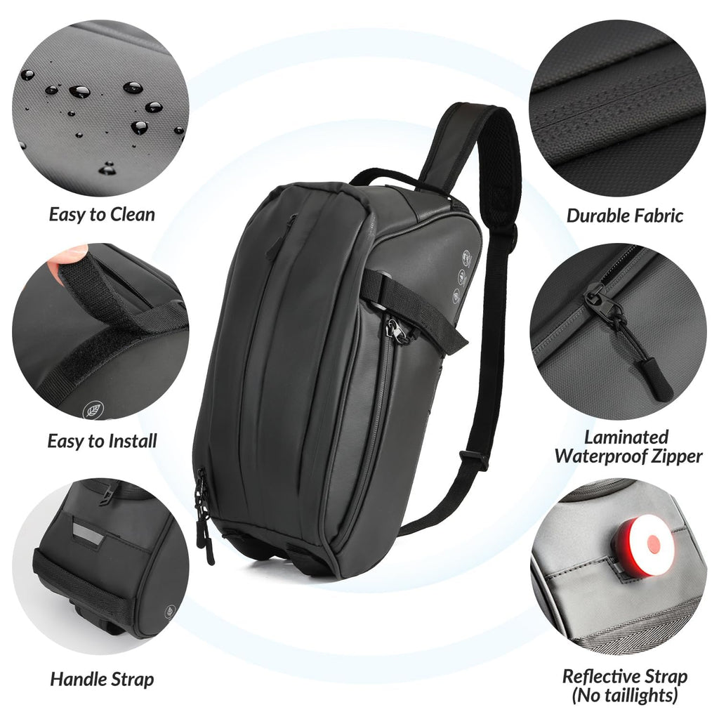 - Rainproof & Built to Last --- The bike trunk pack is made of 600D Oxford fabric coated with superior PU film, which is rainproof and easy to clean. The laminated waterproof zipper also help to prevent rain from penetrating in. Exquisite workmanship, durable and firm, provide a long service life
