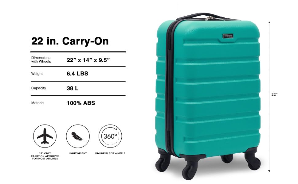 Brand: WranglerColor: TealFeatures: 360 degree spinner wheel system for smooth mobility and easy on the wrist Complete fully-lined inner lining with dividing zipper and compression straps for a full journey's packing Top carry handle for easy lifting Hard shell ABS material and lightweight to meet modern travelers' Needs Meets most,...