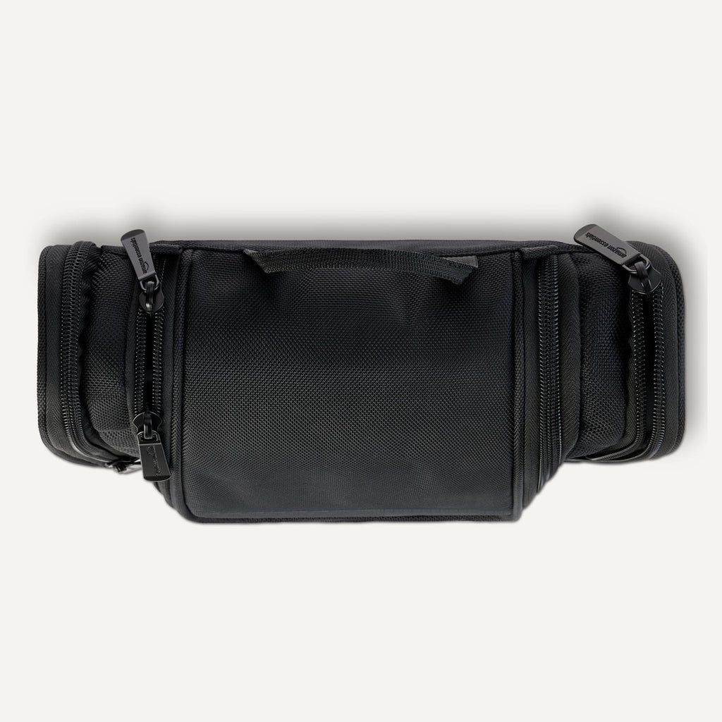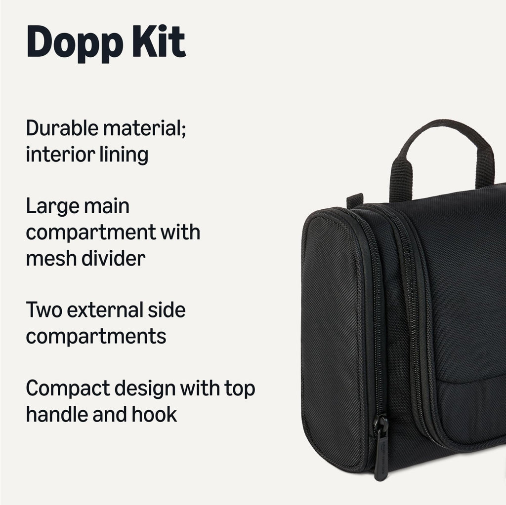 Brand: Amazon EssentialsColor: BlackFeatures: DURABLE CONSTRUCTION: Made with 1680D polyester material and internal lining to easily wipe down leaks and spills AMPLE STORAGE: Large main compartment with mesh divider and internal storage spaces plus 2 external side compartments CONVENIENT HANGING DESIGN: Top hook displays the kit from a shower or...
