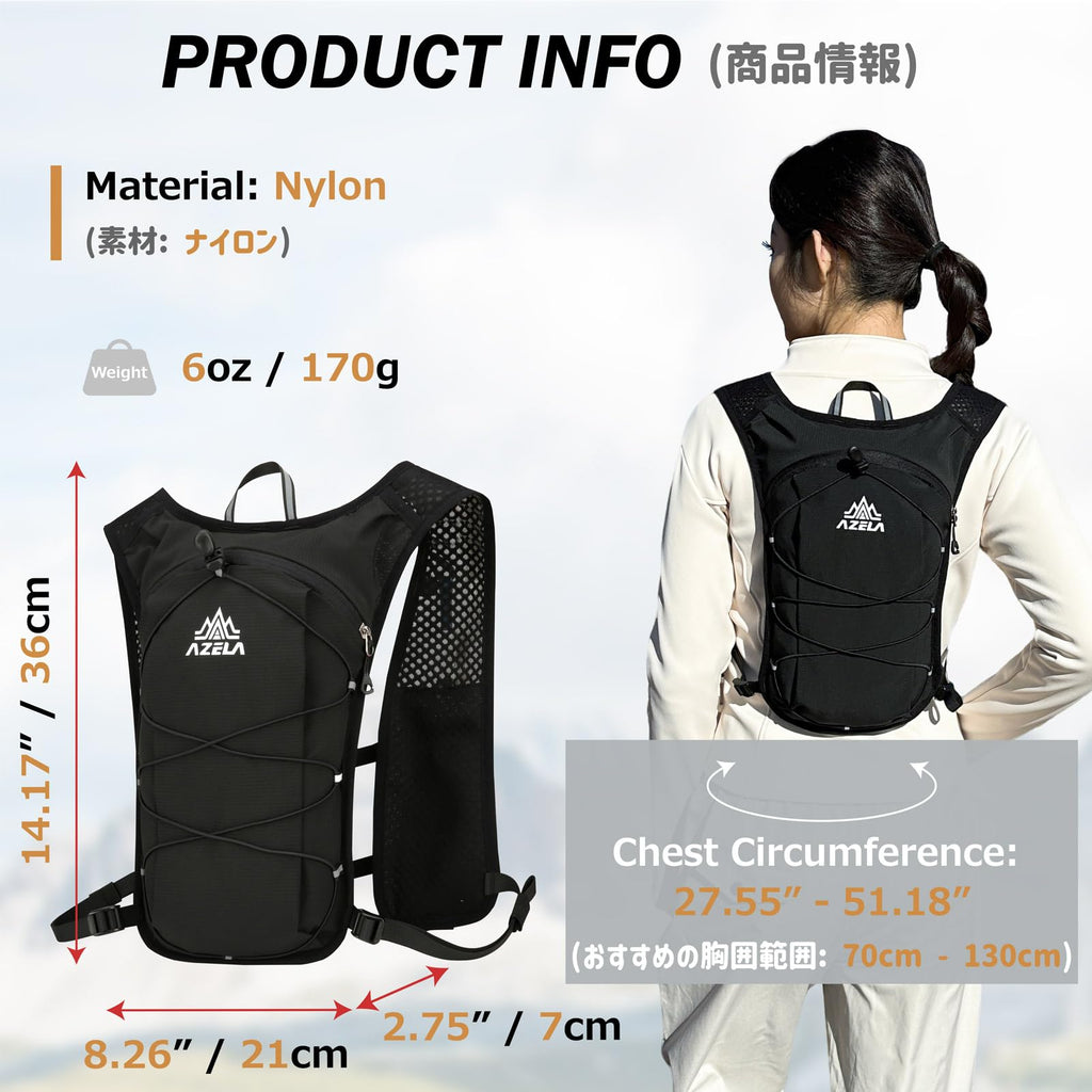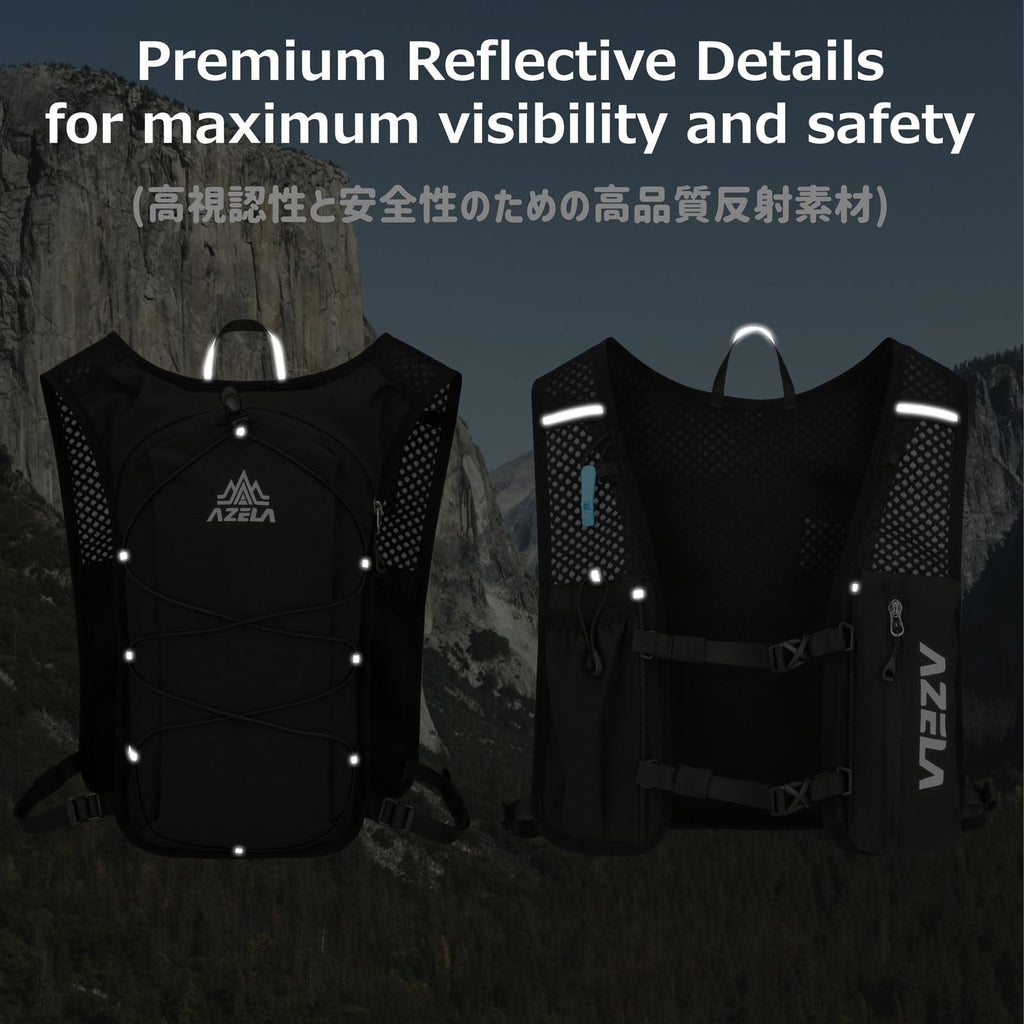 - Durable & Safe: Made with water-resistant nylon, premium zippers, and secure fasteners, this hydration backpack offers lasting durability. Reflective strips and a safety whistle enhance visibility and safety during morning/night runs and trails