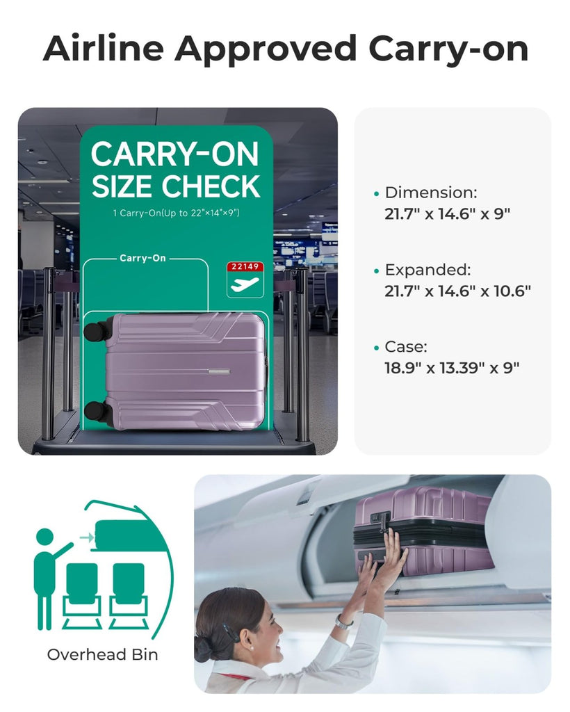 Brand: BAGSMARTColor: Lavender PurpleFeatures: Airline Approved Luggage - Dimensions: 22 x 14 x 9 inches (including wheel and handle height), Volume: 35 L and weighing only 6.83 lbs. The 22 x 14 x 9 carry-on luggage is designed to meet the carry-on limitations of most major airlines worldwide. It fits...