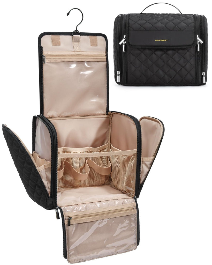 Brand: BAGSMARTColor: BlackFeatures: 【Large Capacity】: The spacious main compartment accommodates a wide range of cosmetics, travel-sized toiletries, and travel accessories, while two zippered side pockets offer additional storage options. The left side pocket is lined with stain-resistant fabric, perfect for storing makeup brushes, while the right side pocket is ideal...