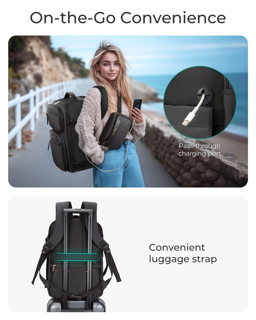 - Airline-Friendly Size: This carry-on travel backpack meets airline personal item size requirements, fitting perfectly in overhead compartments or under the seat. With an integrated data cable hole, you can easily charge your devices on the go. The luggage pass-through strap ensures effortless attachment to your suitcase for added convenience