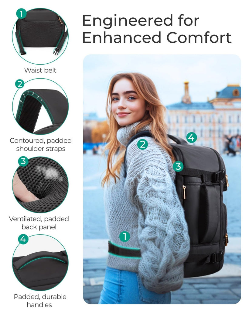 - Comfort Meets Functionality: Crafted with user comfort in mind, carry on travel backpack is equipped with a breathable mesh back panel and thick shoulder straps tominimize strain during extended wear. The adjustable waist belt helps distribute weight for a customized fit, ensuring comfort whether you’re commuting, traveling, or hiking