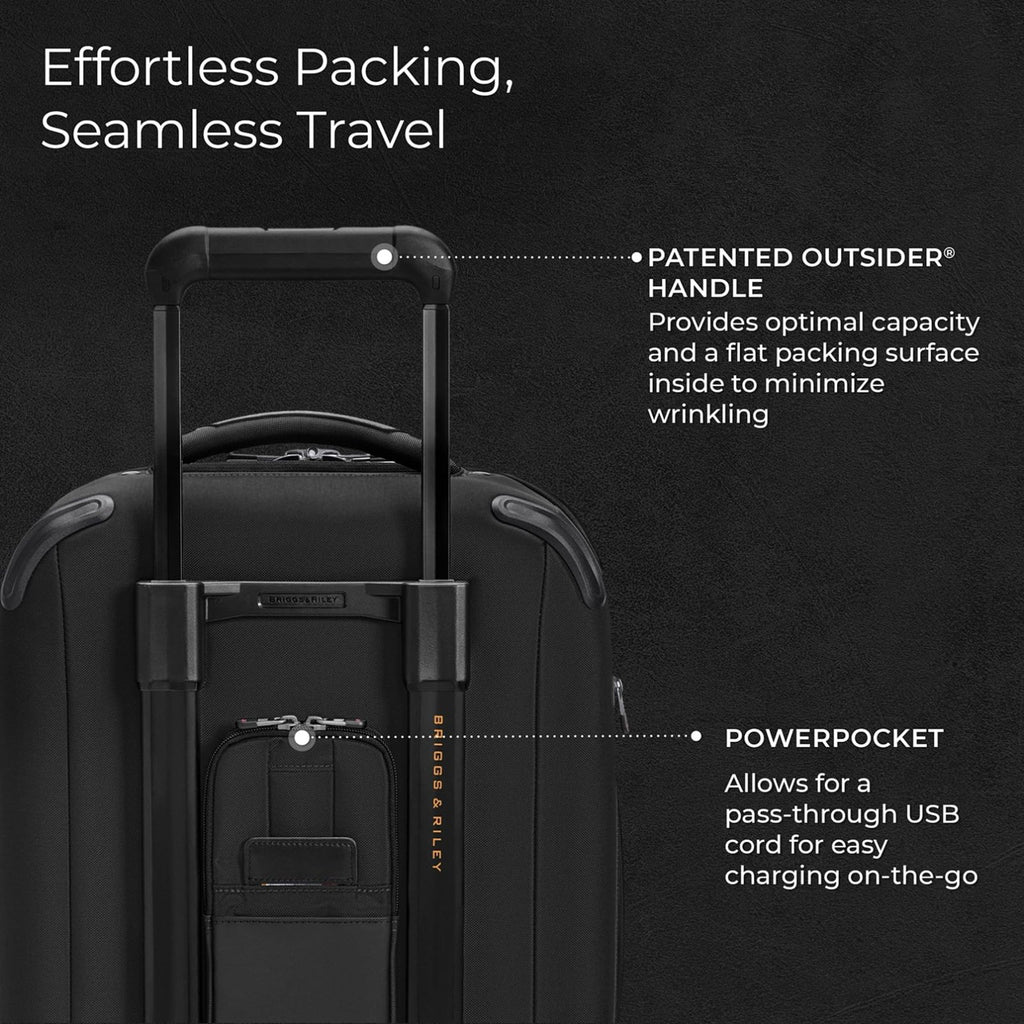 Brand: Briggs & RileyColor: BlackFeatures: DOMESTIC CARRY-ON LUGGAGE - Measuring 22" x 14" x 9-11", this packing system expands up to 25%, then compresses back to its original size to easily fit most US overhead bins 360 SPINNER WHEELS - Move smoothly in any direction with four shock-absorbing spinner wheels...