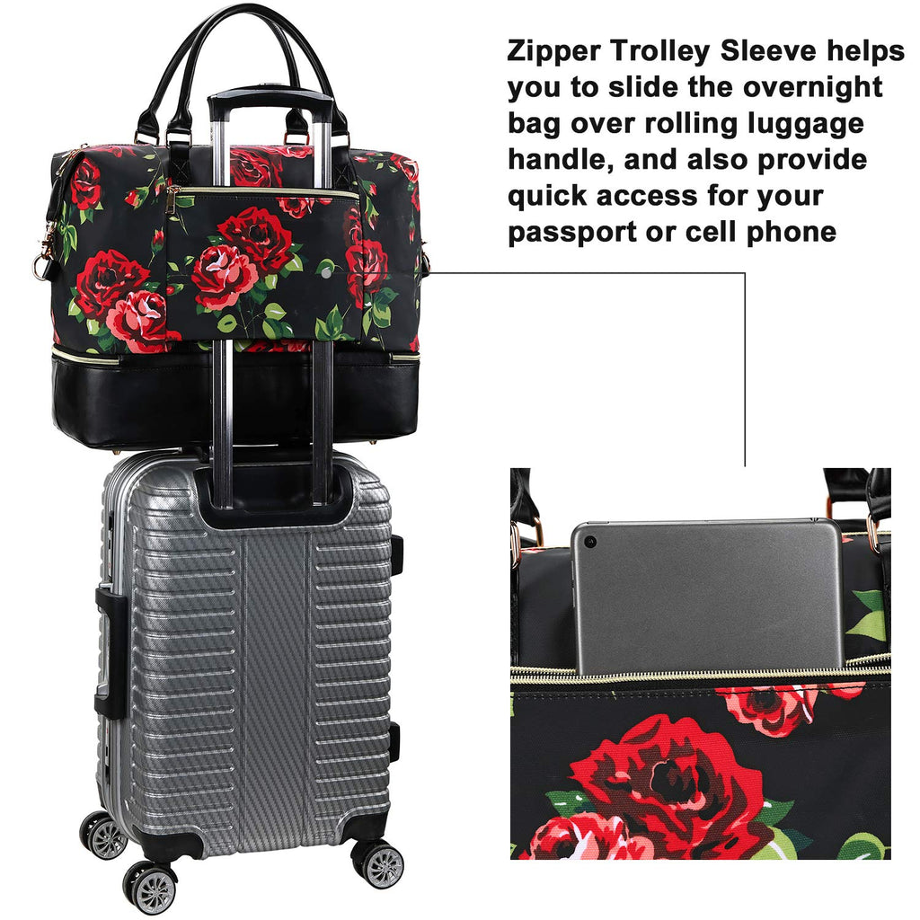 - * Back side with a zipper pocket, and the trolley sleeve makes an easy way to slide the tote on the your rolling suitcase handle. It's an ideal weekend overnight bag for business and personal travel.