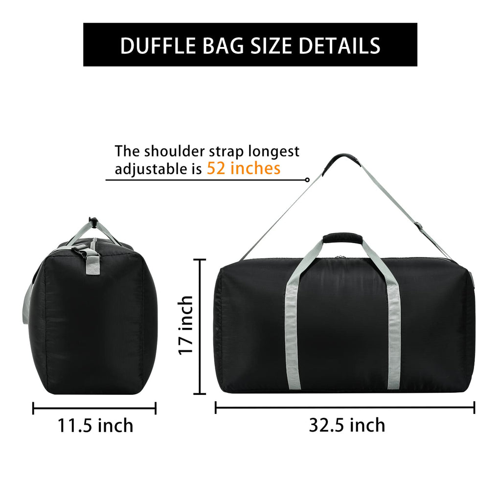 - EASY TO CARRY LIGHTWEIGHT EXTRA LARGE DUFFEL BAG:The duffle bag has a long and comfortable padded carrying strap and handles for different options to carry. Can be folded to small size, easy to carry as a "JUST IN CASE" bag for your trip.