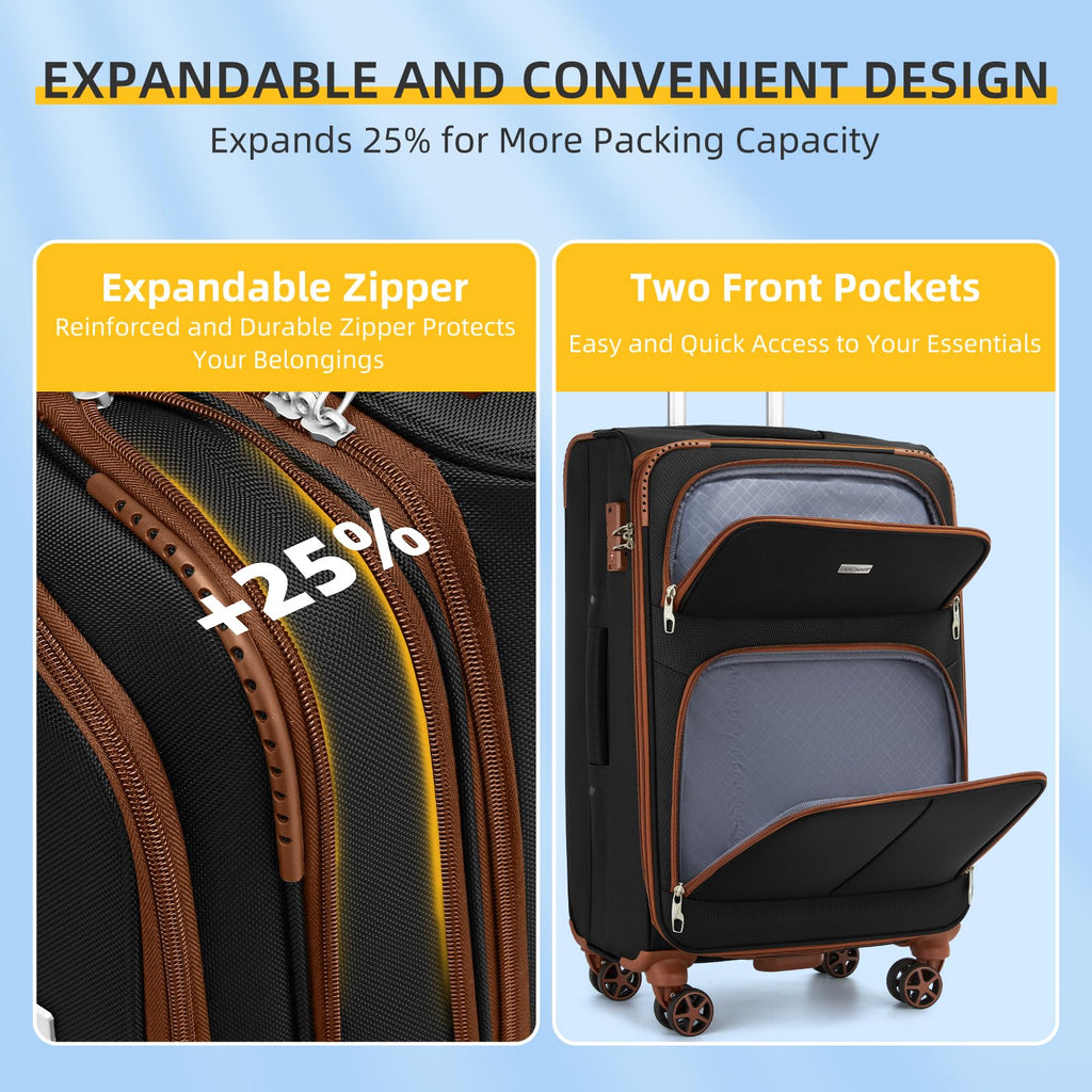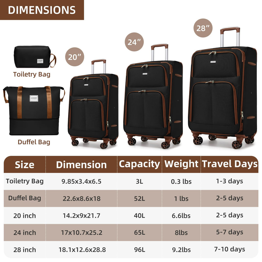 Brand: LARVENDERColor: BlackFeatures: Expandable Softside Luggage Sets: 5 piece set includes 20" carry on suitcase, a 24" checked medium luggage, a 28" checked large luggage, a travel duffel bag and a toiletry bag, can be conveniently stored one into another. Expansion zipper that adds 25% more space (only for 24/28"...