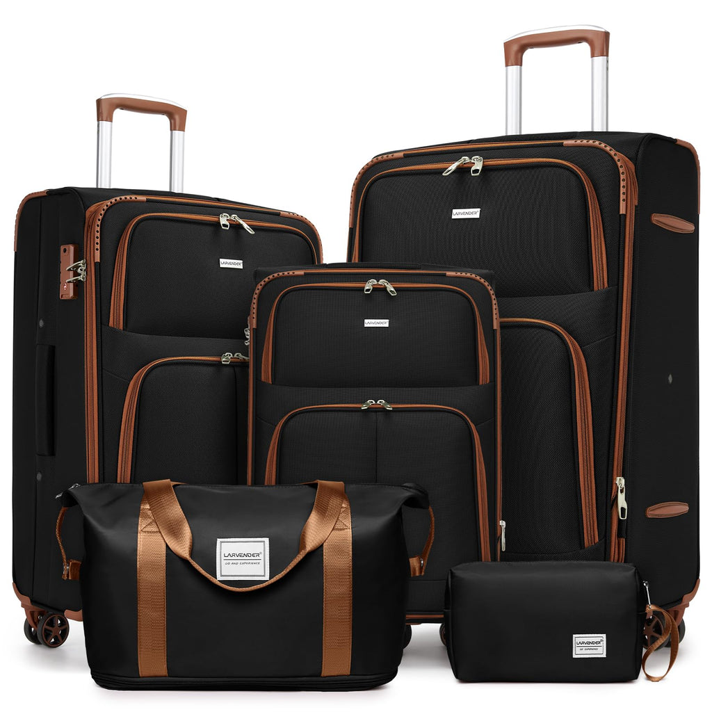 LARVENDER Luggage Sets 5 Piece Softside Expandable Suitcases Set with Spinner Wheels TSA Lock, Lightweight Soft Shell Rolling Travel Luggage Set Clearance for Men and Women, Black Brown