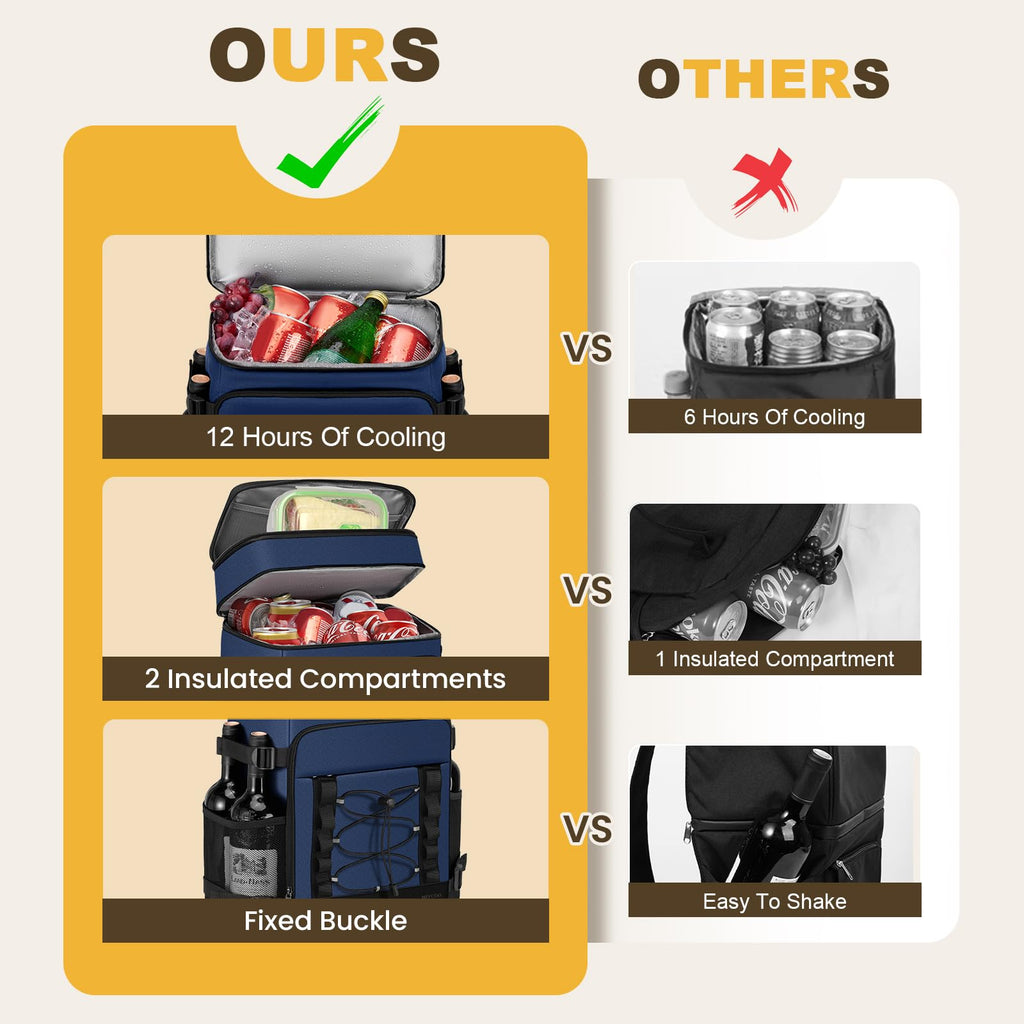 - TWO COMPARTMENTS DESGIN: The large capacity picnic backpack with 2 compartments can hold up to 40 cans (330ml). The top pocket is ideal for utensils and snacks, while the bottom compartment is designed for drinks and fruits
