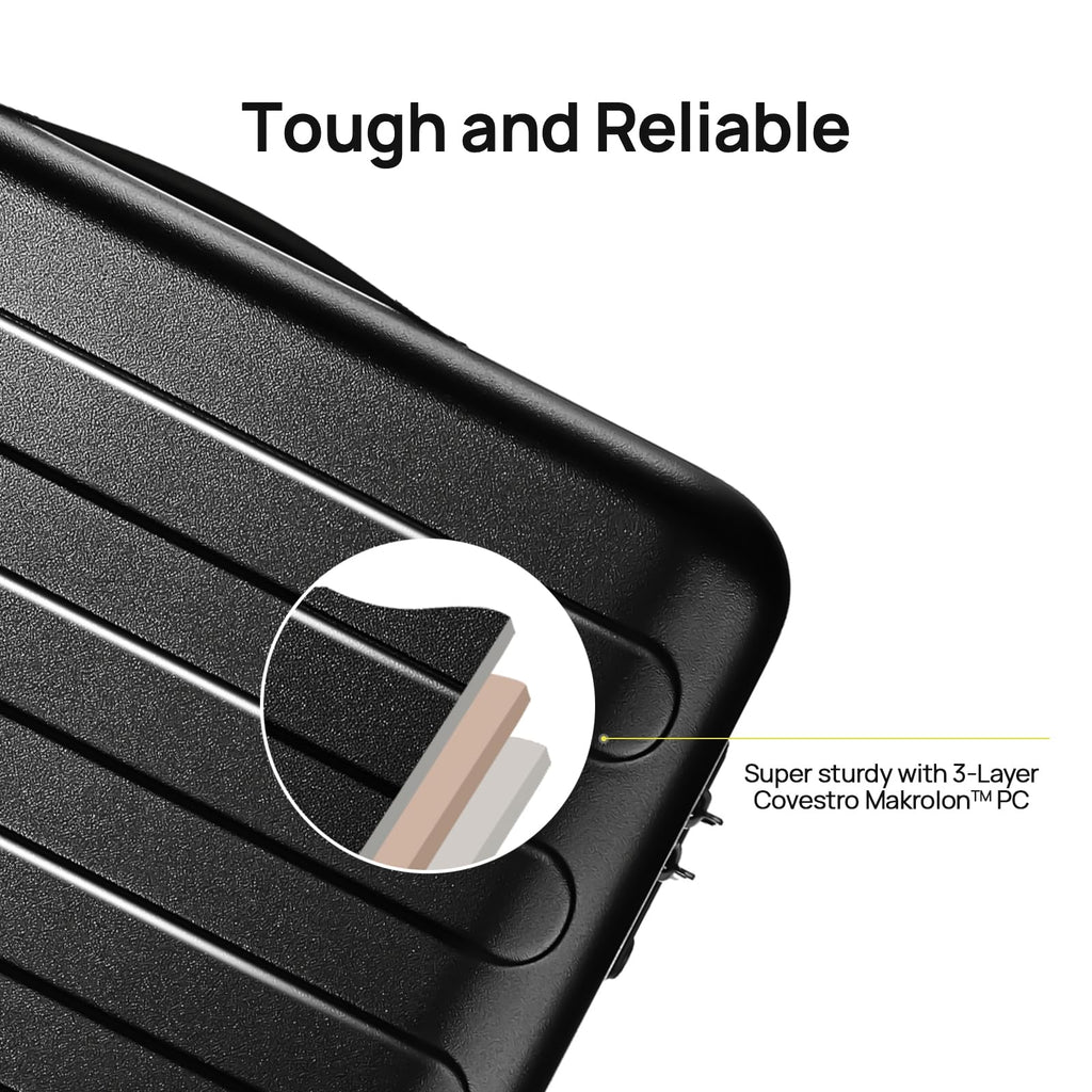 Brand: Nobl TravelColor: Jet BlackFeatures: Strong & Lightweight: Built with a reinforced aluminum frame and impact-resistant polycarbonate shell, this lightweight 9.7 lb. zipperless carry-on is ultra-durable. Dual TSA-approved locks provide extra security, keeping your belongings safe during travel. Stay Charged...