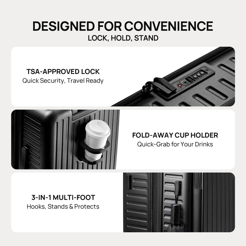 • 【Streamlined Security & On-the-Go Convenience】Travel with peace of mind and hands-free ease. The integrated TSA-approved lock sits flush with the case—no snags, quick security checks. The side-mounted hook foot lifts the case off rough surfaces, preventing scratches and dirt when laid flat, and doubles as a handy hook for umbrellas or small bags when upright. A built-in cup holder keeps your drink secure, freeing your hands for tickets, phone, or other belongings.