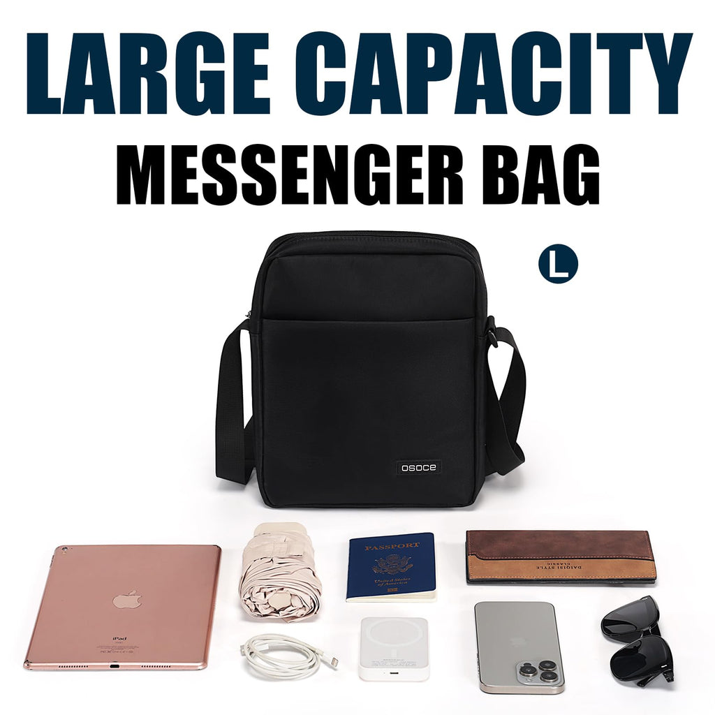 Brand: OSOCEColor: 1.0 BlackFeatures: ✔[Messenger Bag for Men] OSOCE shoulder bag for men has two sizes: 8.07 * 2.16 * 10.2 inches (S), 9.8 *2.16* 11.8 inches (L), S can fit 9.7 inches iPad, L can fit 11 inches iPad. That man purse for men is made of water resistant...