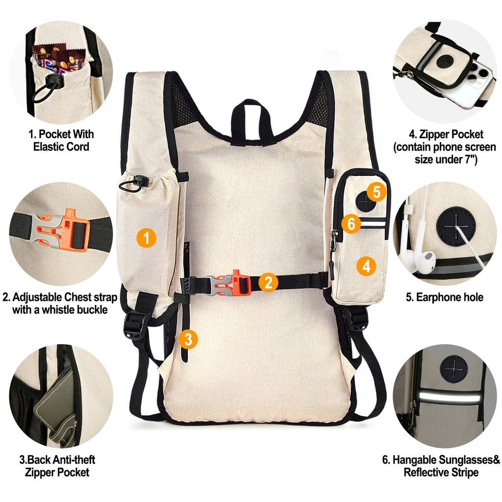 - 【Unique Shoulder Strap Design】The zippered pocket on the left shoulder strap will hold a cell phone screen up to 7 inches, and on the right shoulder strap is an anti-theft pocket with an elastic cord closure, so you can put some items such as a wallet and snacks. The breathable mesh shoulder straps ensure comfort during your outdoor adventures, while reinforced stress points prevent strap breakage.