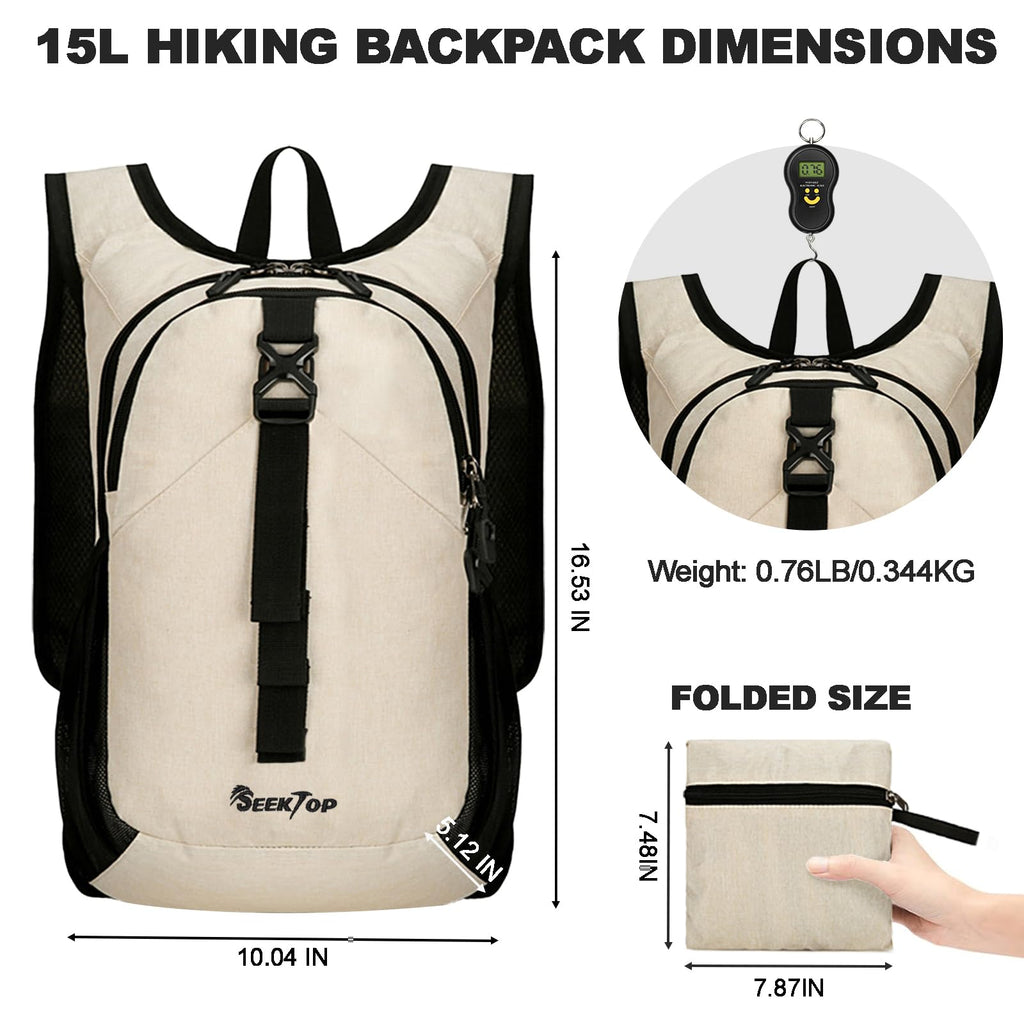 Brand: SeektopColor: BeigeFeatures: 【Lightweight And Foldable Backpack】 Seektop lightweight travel backpack weighs only 0.76 lbs but has a capacity of 15 liters, ideal for adult hikers seeking minimalist gear for day trips. Folds into 7.48"x7.87" compact pouch using built-in zippered pocket, effortlessly store in travel luggage as backup hiking backpack...