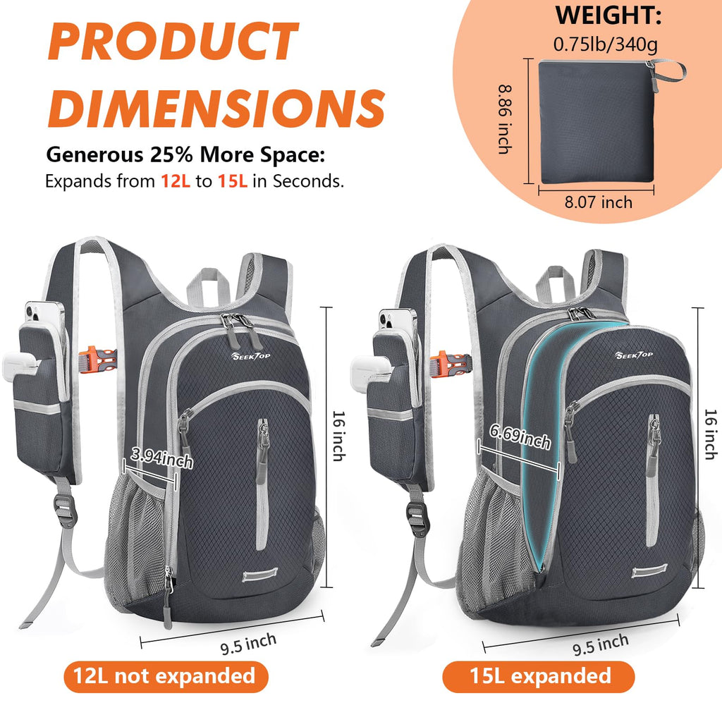 Seektop Expandable Small Hiking Backpack 12L-15L Lightweight Packable Waterproof Daypack with Phone Pocket for Women Men