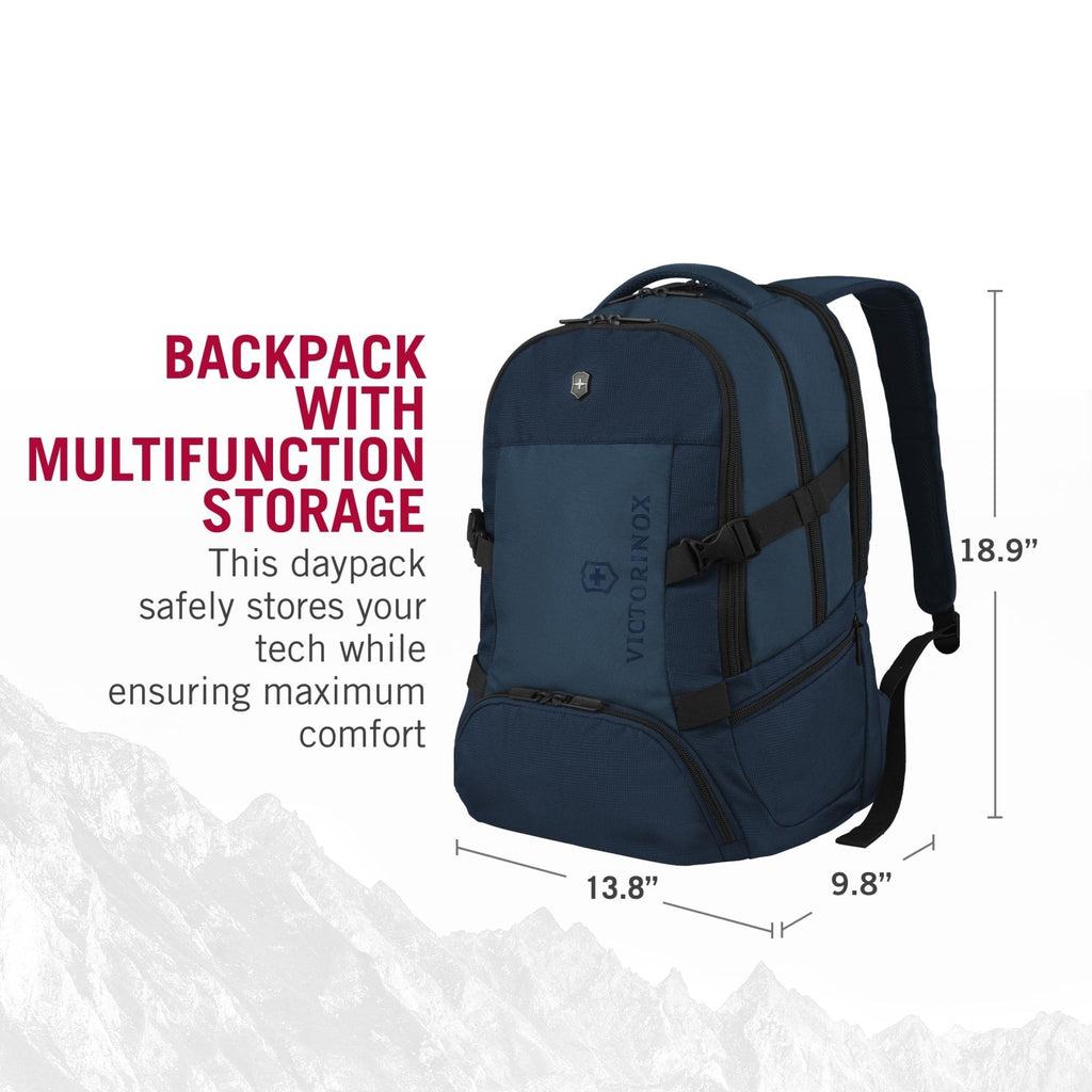 Brand: VictorinoxColor: BlueFeatures: Sleek Backpack: This travel bag features tech compartments, adjustable straps, and airflow channels so you can travel efficiently and comfortably VX Sport Backpacks: Travelers can rely on these high-quality, durable, and versatile backpacks to carry or wheel their gear Premium Travel Backpack: Zip right through at the...