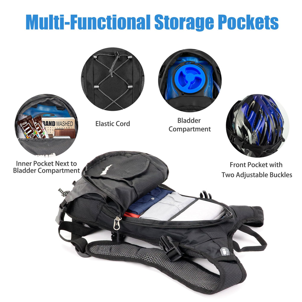 - CONTAIN WATER BLADDER — Zavothy hydration pack backpack with 2L water reservoir. The bladder is BPA-free and anti-leak guaranteed. Stay hydrated in any time without taking an extra water bottle. Convenient and frees up your hands